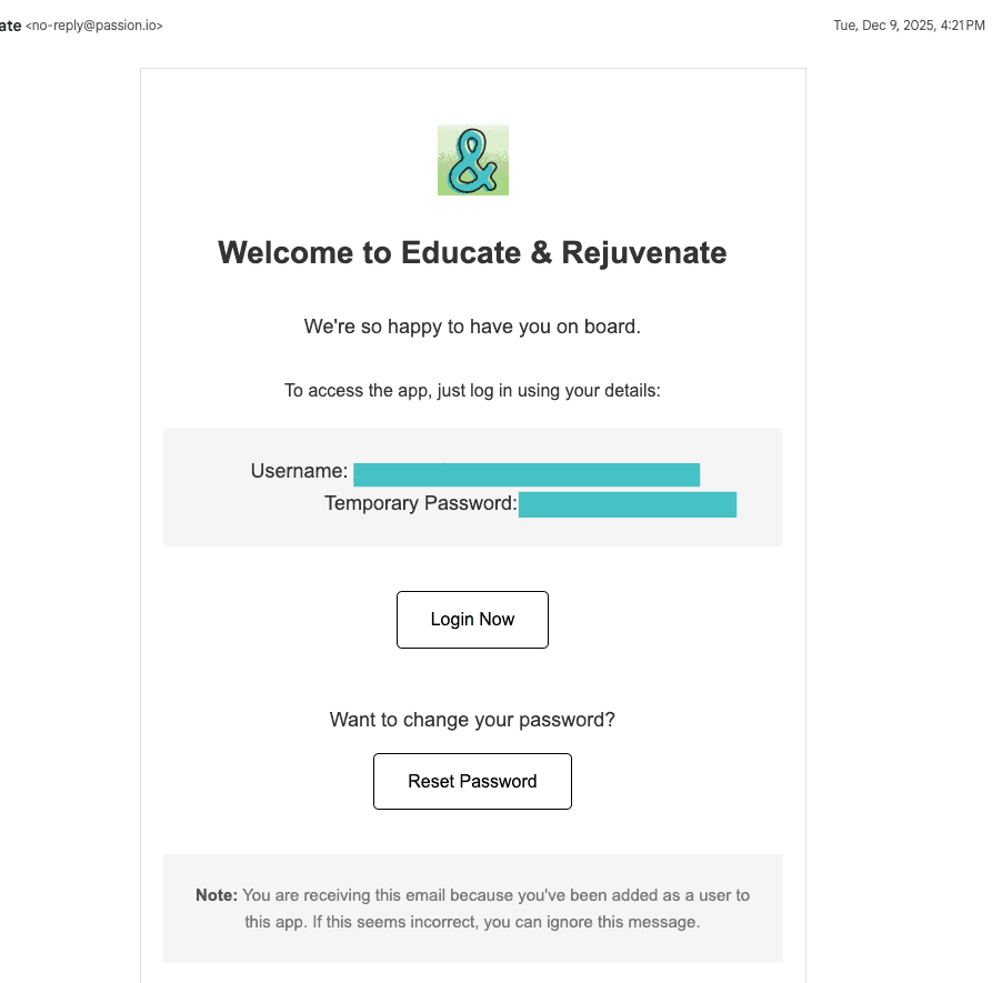 The email will be from “Team Educate & Rejuvenate” at no-reply@passion.io. It will looks like this: