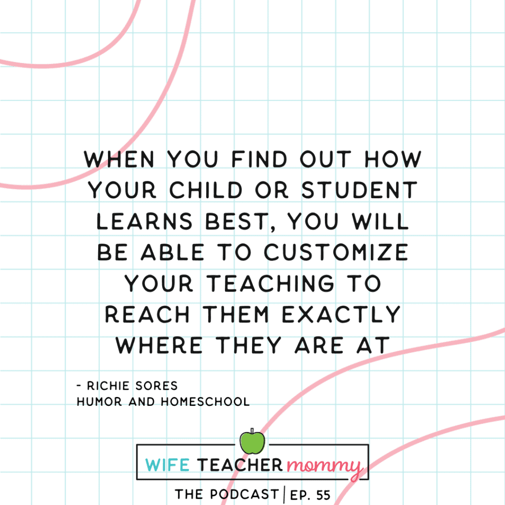 You are listening to episode number 55 of wife teacher mommy the podcast. The three learning styles you need to know if you teach kids with Richie sores from homeschool in humor. Just like we all have our own teaching styles children have their own learning styles too. So whether you homeschool like Vici or you’re an elementary teacher in a school setting, you’ll walk away learning how to identify these learning styles in the children you teach and how it can help you inform your instruction.
