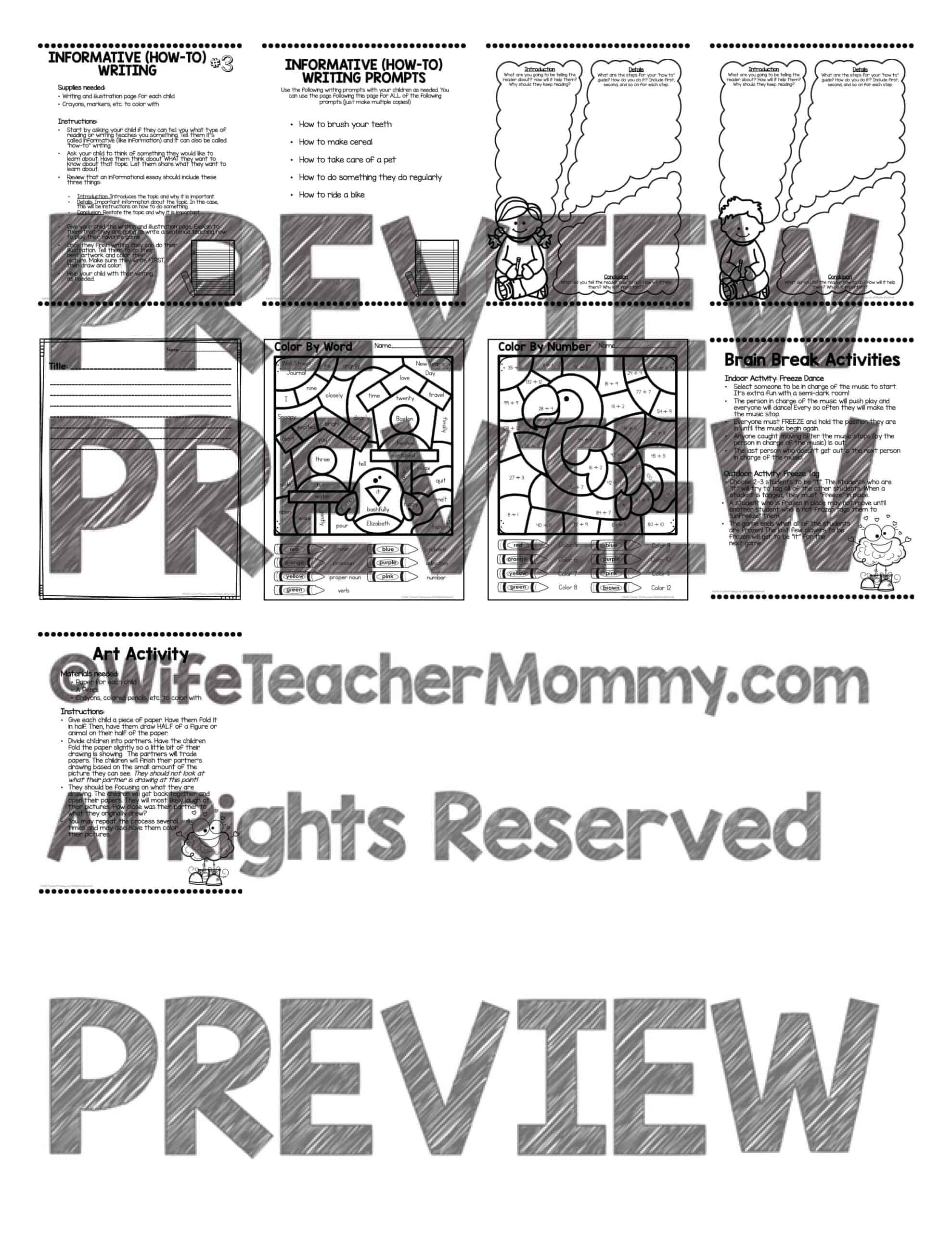 - Informative (How-To) Writing Lesson: Students will write a short story using the suggested prompts for the week. Lesson plan, brainstorming page, and writing/illustration page included.