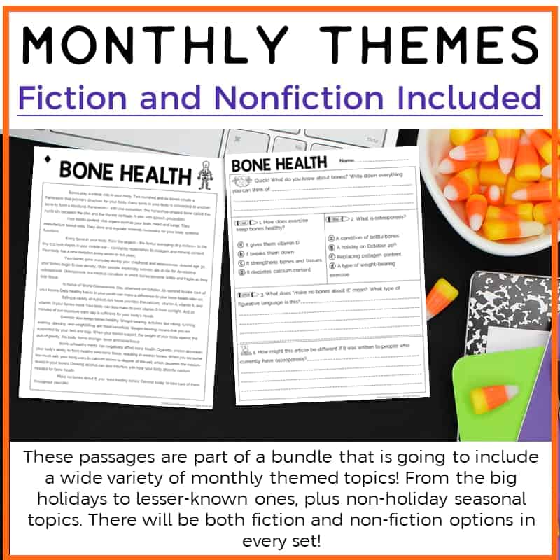 - Bone Health Passages & Questions – Learn what your bones do for you and how to take care of them. Themes: World Osteoporosis Day (October 20), and if you want to get creative, you could tie the skeleton into Halloween
