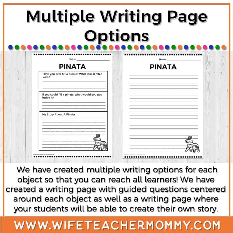 - 2 different writing options for each object including a page with guided questions and a blank writing page for your students to create their own story
