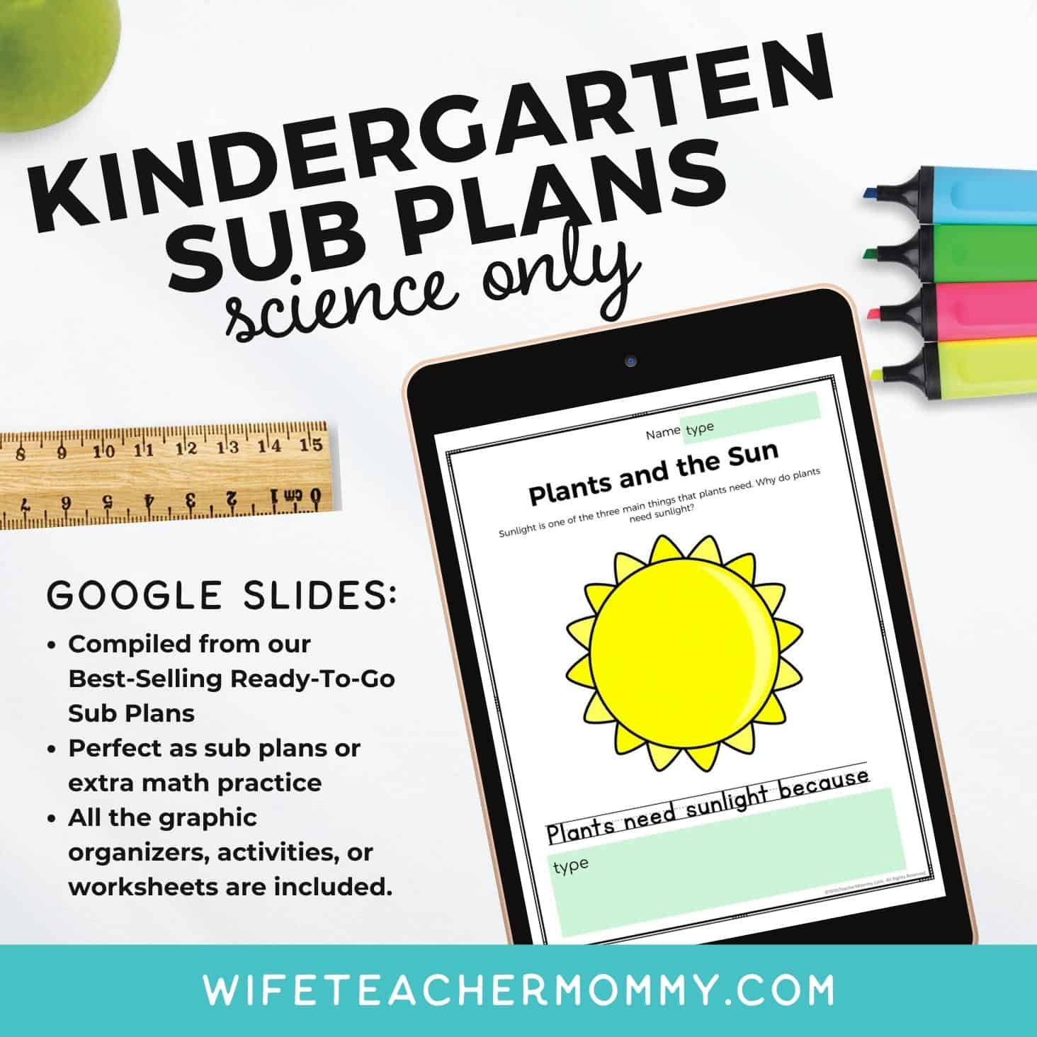 Each lesson in these digital kindergarten science sub plans is simple enough for the sub to follow, but will engage your students in authentic learning …and not just busy work. Each lesson plan has a section for teacher notes at the bottom for any notes you’d like to leave for the sub (or for the sub to leave you notes!) All the graphic organizers, activities, or worksheets needed to complete every lesson are included. The following topics are included: