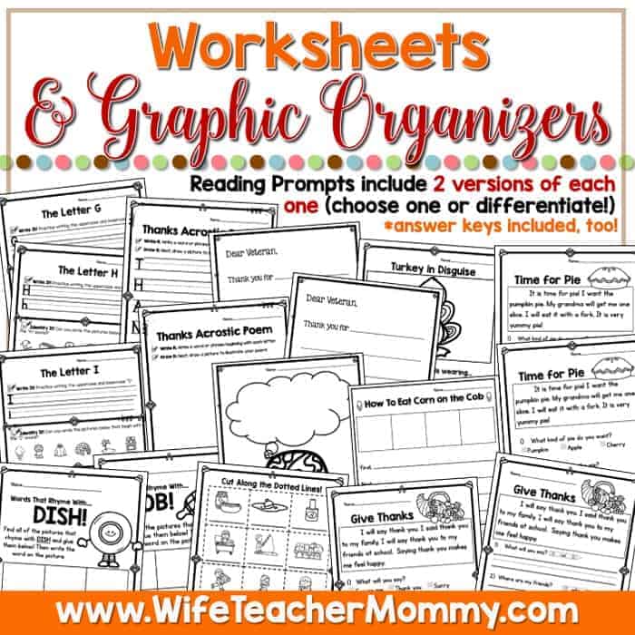 - 2 reading prompts are included at 2 different levels. Choose one to use or use both and differentiate! One of the prompts is about giving thanks and the other is about eating pie.