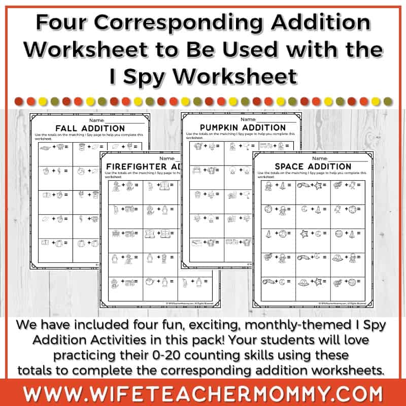 - 4 Themed Addition Worksheets using the totals from the I Spy Worksheets