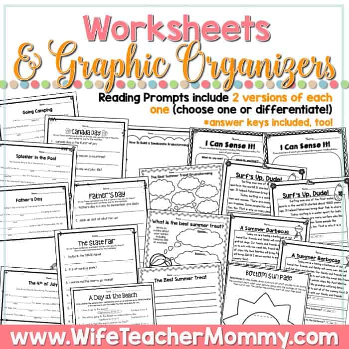 - 2 reading prompts are included at 2 different levels. (Multiple choice or written response with crayon underlining). Choose one to use or use both and differentiate! One of the prompts is a narrative about a summer barbecue and the other is an informational piece about surfing.