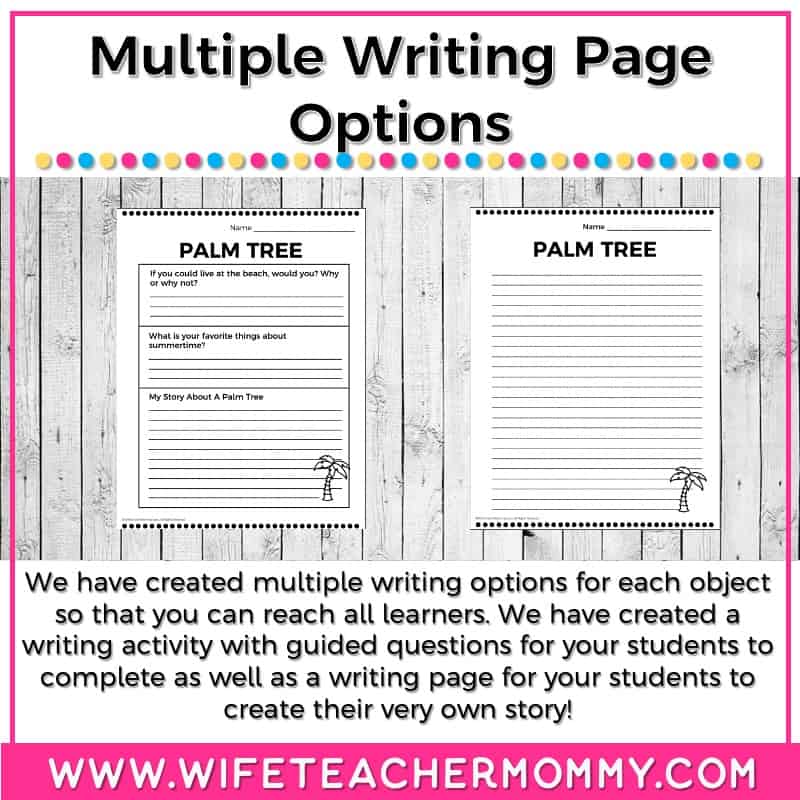 - 2 different writing options for each object including a page with guided questions and a blank writing page for your students to create their own story