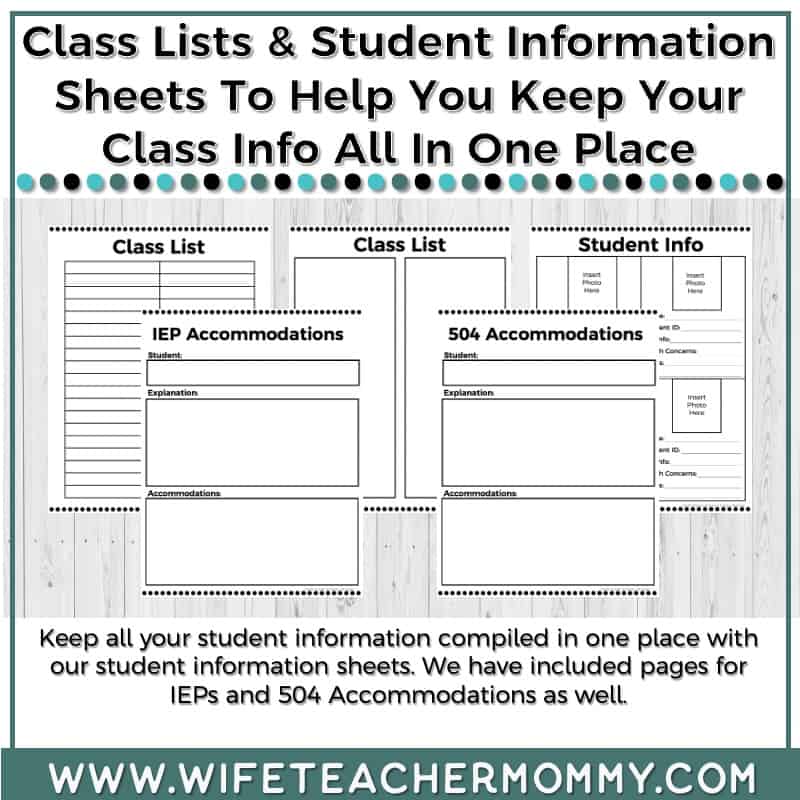 - Class List Sheets and Student Information Pages to help you keep track of each student’s individual needs