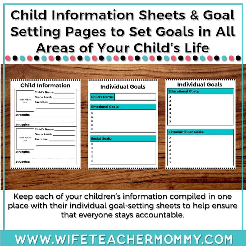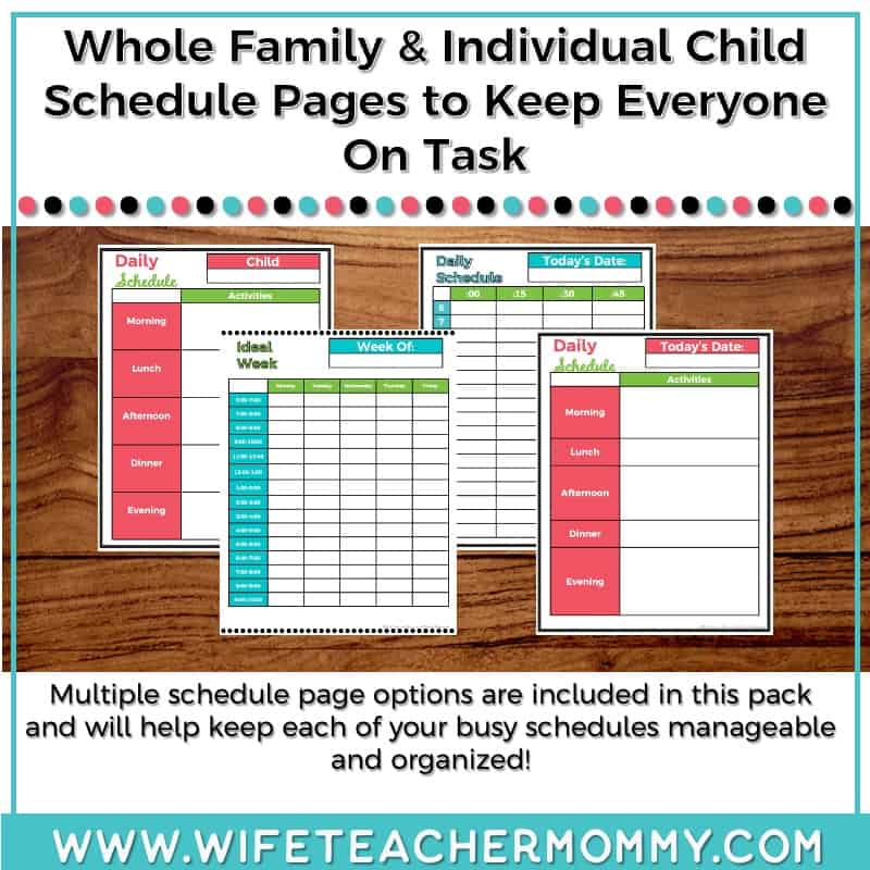 - Whole family and individual child schedule sheets so that you can plan in a way that makes sense to you.