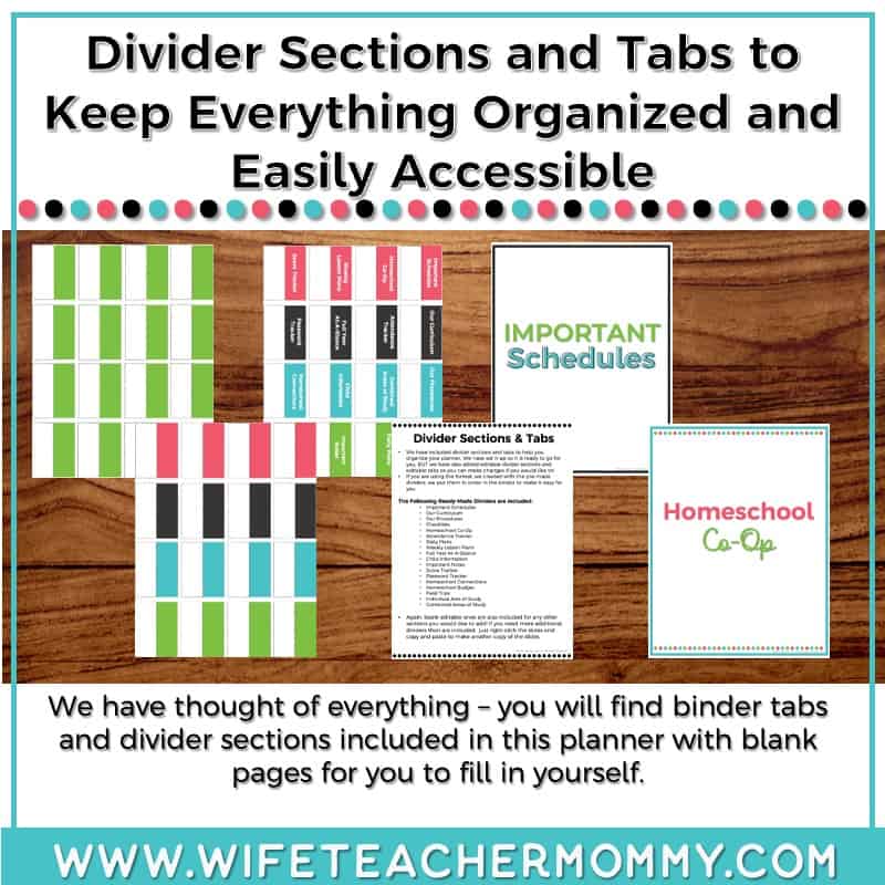- Divider sections and binder tabs ensure that everything you need inside your planner for homeschooling is easy to find.