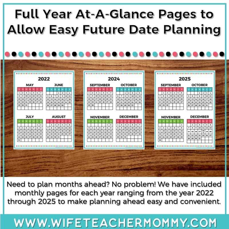 - Full year-at-a-glance pages to make planning ahead easy