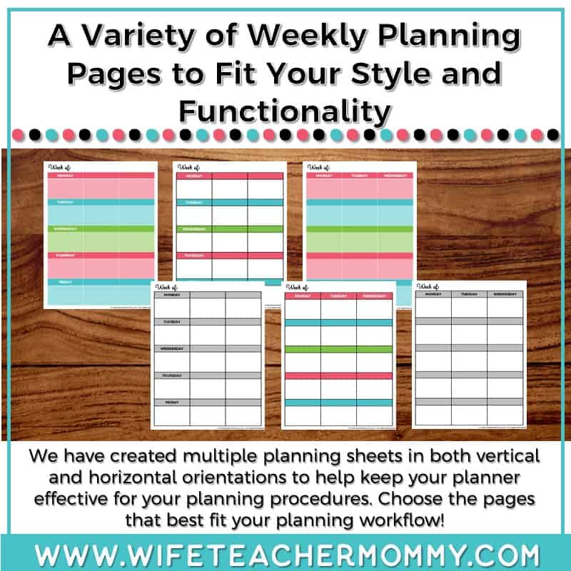 - A variety of weekly planning sheets allow you to choose the pages that best fit your needs.