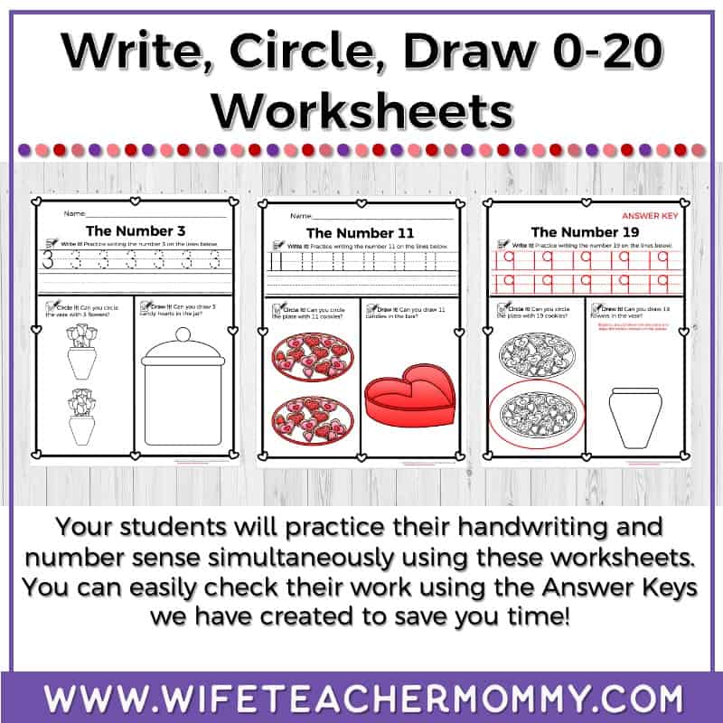 These Valentine-themed 0-20 numbers worksheets are perfect for students who are practicing their numbers, counting, and handwriting! The Write, Circle, Draw format is a lot of fun for kids. The students will trace and write each number, circle the Valentine’s Day picture that has the correct number, and add to a Valentine’s Day picture with the correct number of items. Perfect for Preschool, Pre-K, and Kindergarten teachers and homeschoolers!