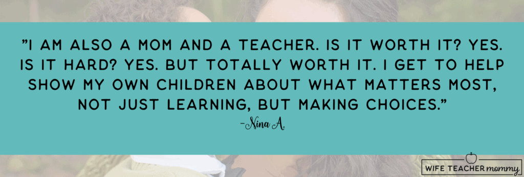 “I am also a mom and a teacher. Is it worth it? Yes. Is it hard? Yes. But totally worth it. I get to help show my own children about what matters most, not just learning, but making choices. My own children see me working hard to help out 20 something kids every day. I am not just it doing for me, but for them. I hope I am being a good example for my own children, and they get to see and hear all the work that goes into teaching. So I hope they treat their own teachers a little better because of it. My own kids and my classroom kids – there is a big difference – but I love them all.” -Nina A.